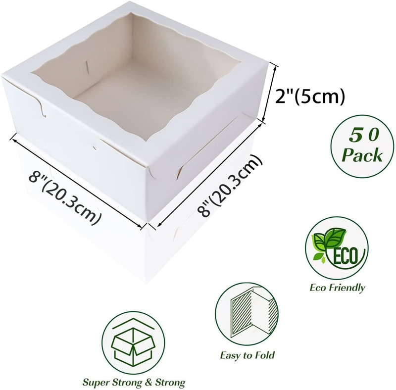 【Quantity;Size】50 Pack Bakery boxes only,not including any food, Length:8 inches (20.3CM) x Width: 8inches(20.3CM) x Height:2 inches(5CM)